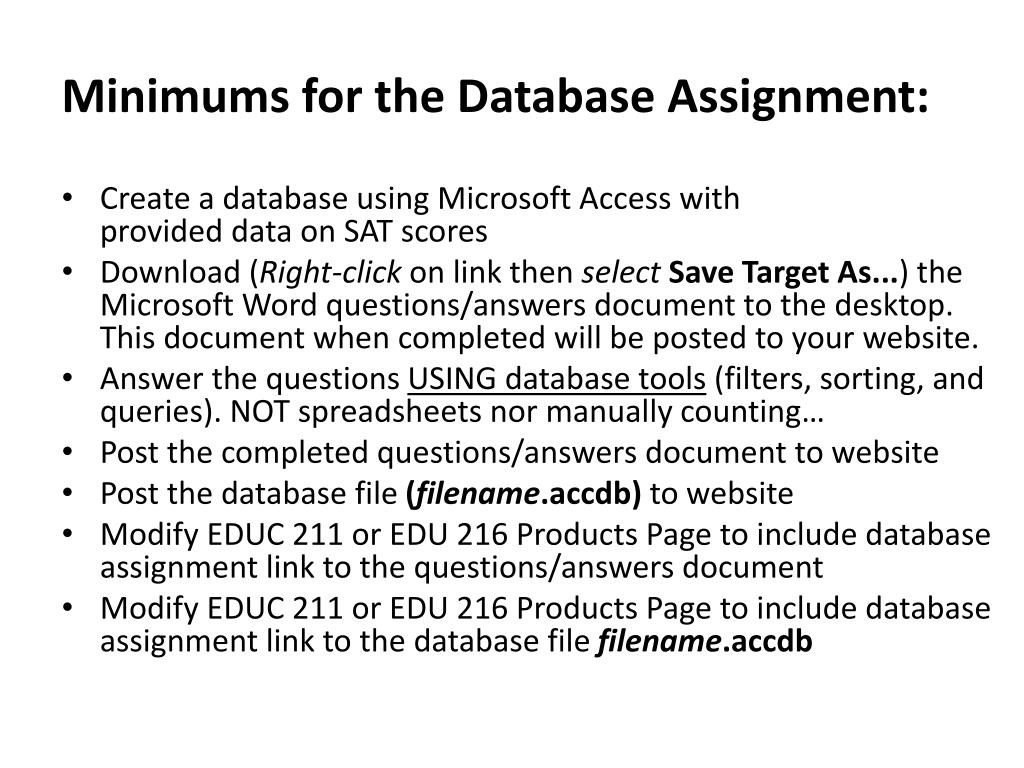 Minimums for the Database Assignment: • Create a database using Microsoft Access with provided data on SAT scores • Download (Right-click on link then selectSave Target As...) the Microsoft Word questions/answers document to the desktop. This document when completed will be posted to your website. • Answer the questions USING database tools (filters, sorting, and queries). NOT spreadsheets nor manually counting… • Post the completed questions/answers document to website • Post the database file (filename.accdb) to website • Modify EDUC 211 or EDU 216 Products Page to include database assignment link to the questions/answers document • Modify EDUC 211 or EDU 216 Products Page to include database assignment link to the database file filename.accdb