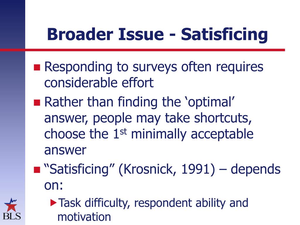 Broader Issue - Satisficing • Responding to surveys often requires considerable effort • Rather than finding the ‘optimal’ answer, people may take shortcuts, choose the 1st minimally acceptable answer • “Satisficing” (Krosnick, 1991) – depends on: • Task difficulty, respondent ability and motivation