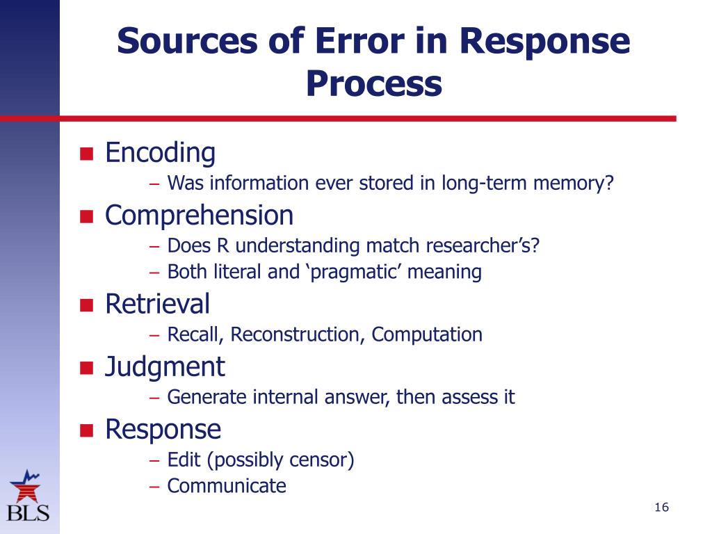 Sources of Error in Response Process • Encoding • Was information ever stored in long-term memory? • Comprehension • Does R understanding match researcher’s? • Both literal and ‘pragmatic’ meaning • Retrieval • Recall, Reconstruction, Computation • Judgment • Generate internal answer, then assess it • Response • Edit (possibly censor) • Communicate