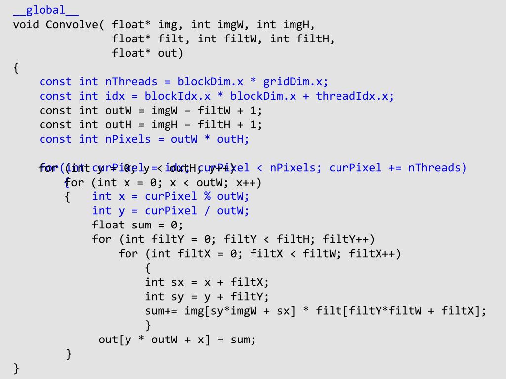 __global__ void Convolve( float* img, int imgW, int imgH, float* filt, int filtW, int filtH, float* out) { const int nThreads = blockDim.x * gridDim.x; const int idx = blockIdx.x * blockDim.x + threadIdx.x; const int outW = imgW – filtW + 1; const int outH = imgH – filtH + 1; const int nPixels = outW * outH; for(int curPixel = idx; curPixel < nPixels; curPixel += nThreads) { int x = curPixel % outW; int y = curPixel / outW; float sum = 0; for (int filtY = 0; filtY < filtH; filtY++) for (int filtX = 0; filtX < filtW; filtX++) { int sx = x + filtX; int sy = y + filtY; sum+= img[sy*imgW + sx] * filt[filtY*filtW + filtX]; } out[y * outW + x] = sum; } } Kernel - Example code pt 1 for (int y = 0; y < outH; y++) for (int x = 0; x < outW; x++) {