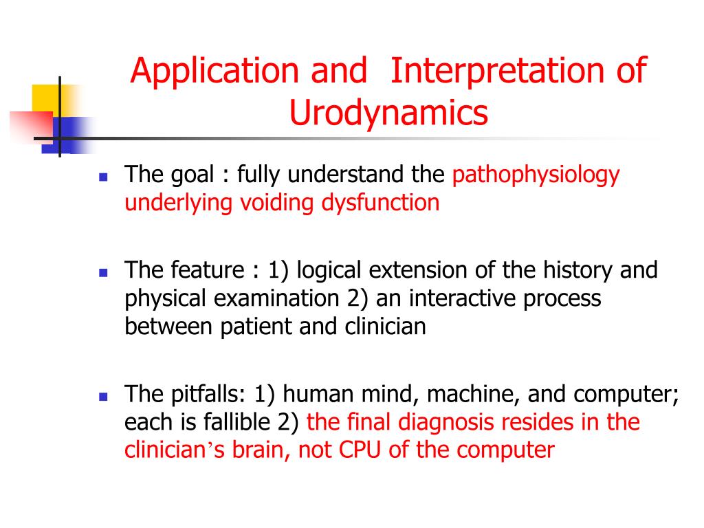 Application and Interpretation of Urodynamics • The goal : fully understand the pathophysiology underlying voiding dysfunction • The feature : 1) logical extension of the history and physical examination 2) an interactive process between patient and clinician • The pitfalls: 1) human mind, machine, and computer; each is fallible 2) the final diagnosis resides in the clinician’s brain, not CPU of the computer