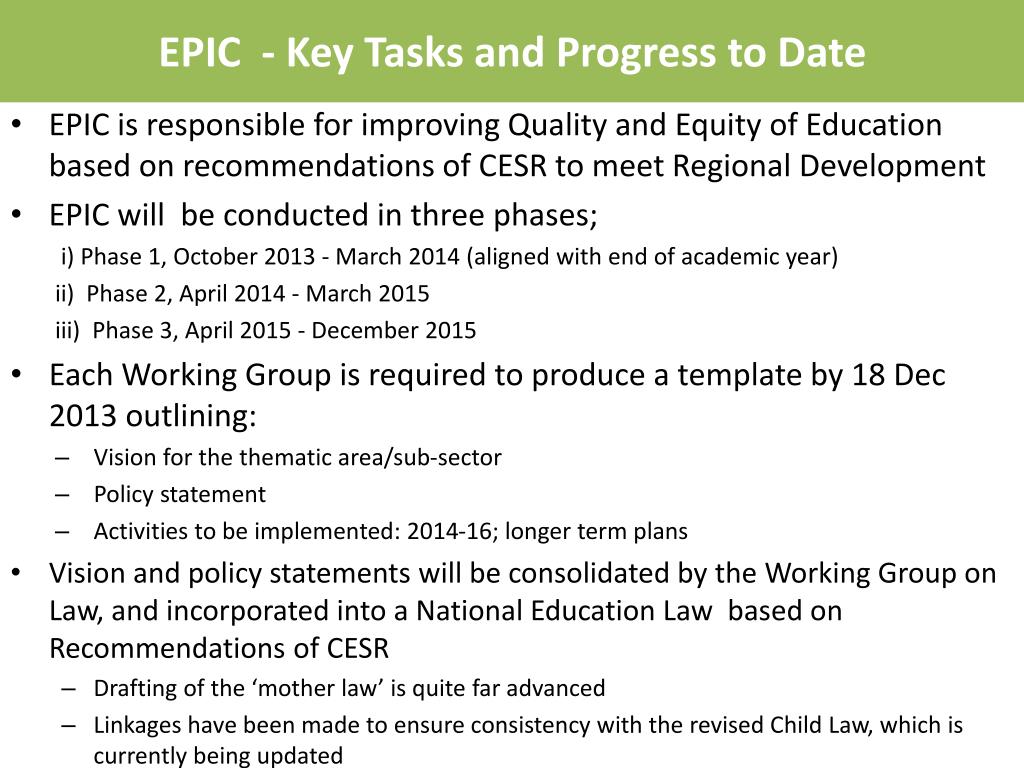 EPIC - Key Tasks and Progress to Date • EPIC is responsible for improving Quality and Equity of Education based on recommendations of CESR to meet Regional Development • EPIC will be conducted in three phases; i) Phase 1, October 2013 - March 2014 (aligned with end of academic year) ii) Phase 2, April 2014 - March 2015 iii) Phase 3, April 2015 - December 2015 • Each Working Group is required to produce a template by 18 Dec 2013 outlining: • Vision for the thematic area/sub-sector • Policy statement • Activities to be implemented: 2014-16; longer term plans • Vision and policy statements will be consolidated by the Working Group on Law, and incorporated into a National Education Law based on Recommendations of CESR • Drafting of the ‘mother law’ is quite far advanced • Linkages have been made to ensure consistency with the revised Child Law, which is currently being updated
