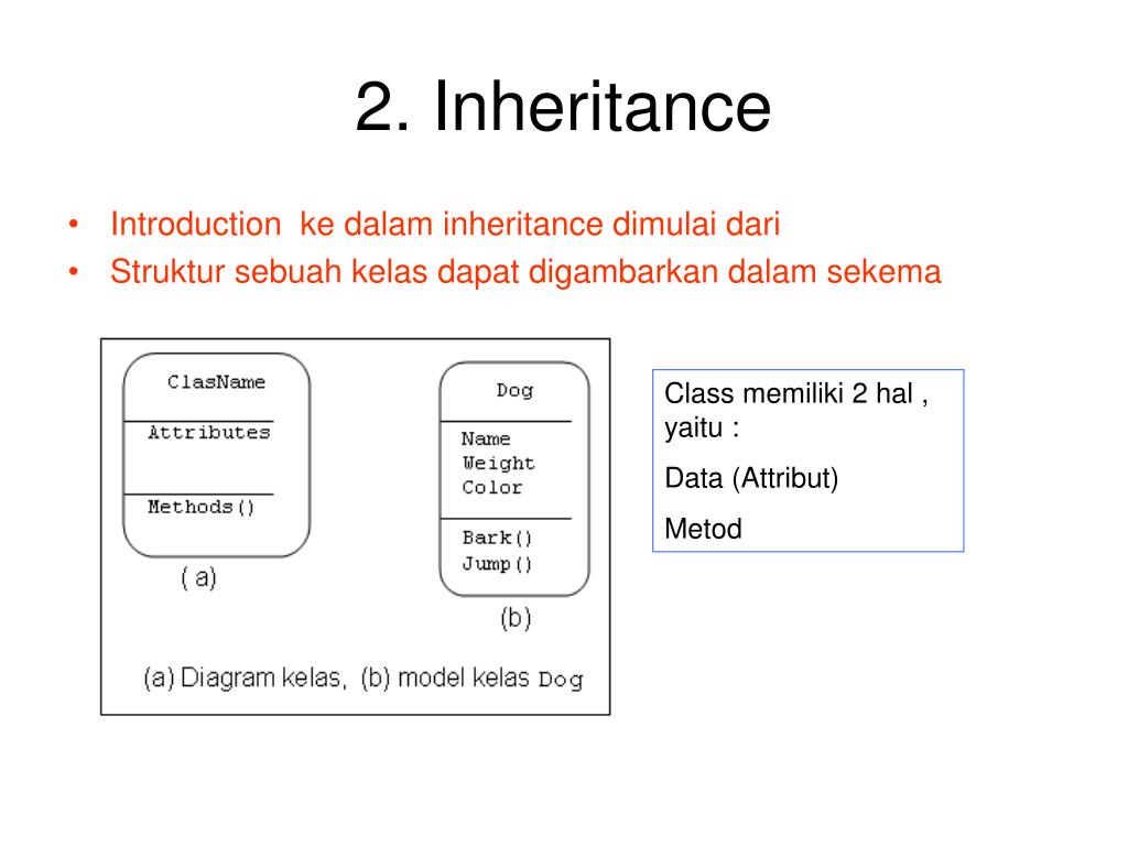 2. Inheritance • Introduction ke dalam inheritance dimulai dari • Struktur sebuah kelas dapat digambarkan dalam sekema Class memiliki 2 hal , yaitu : Data (Attribut) Metod