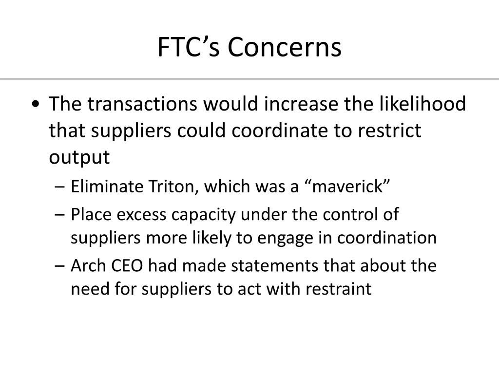 FTC’s Concerns • The transactions would increase the likelihood that suppliers could coordinate to restrict output • Eliminate Triton, which was a “maverick” • Place excess capacity under the control of suppliers more likely to engage in coordination • Arch CEO had made statements that about the need for suppliers to act with restraint