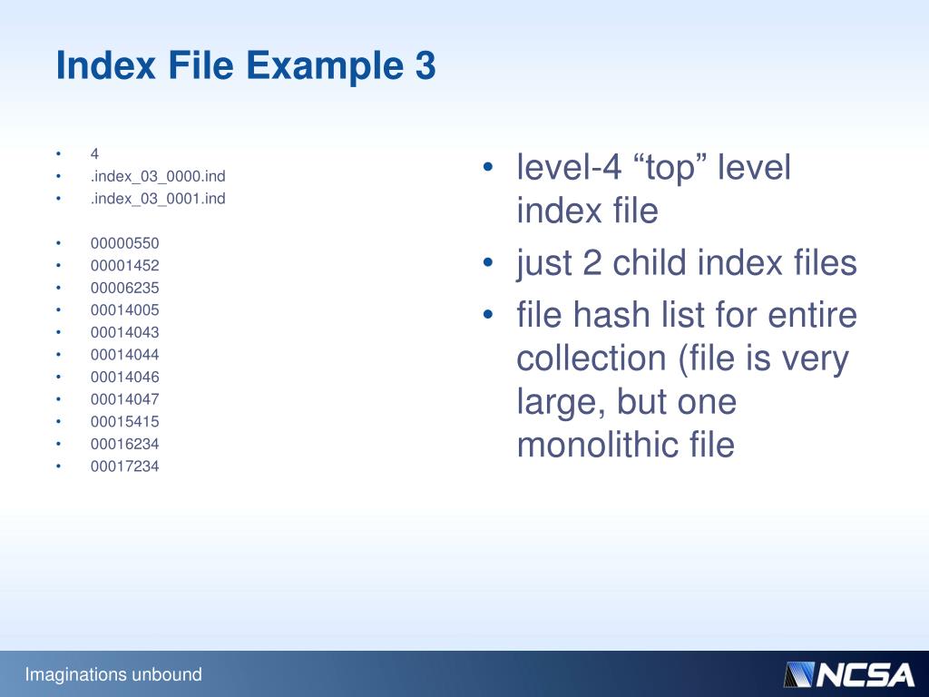 Index File Example 3 • 4 • .index_03_0000.ind • .index_03_0001.ind • 00000550 • 00001452 • 00006235 • 00014005 • 00014043 • 00014044 • 00014046 • 00014047 • 00015415 • 00016234 • 00017234 • level-4 “top” level index file • just 2 child index files • file hash list for entire collection (file is very large, but one monolithic file Imaginations unbound