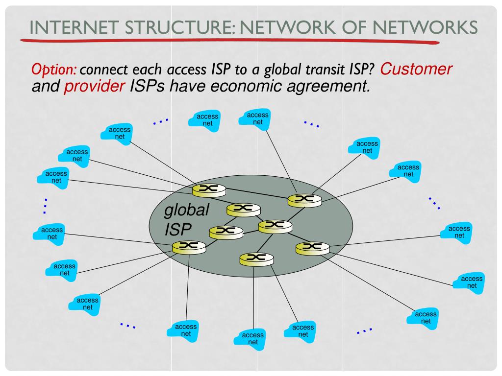 Internet structure: network of networks Option: connect each access ISP to a global transit ISP? Customer and provider ISPs have economic agreement. … … … … globalISP access net access net access net access net access net access net access net access net access net access net access net access net access net access net access net access net … …