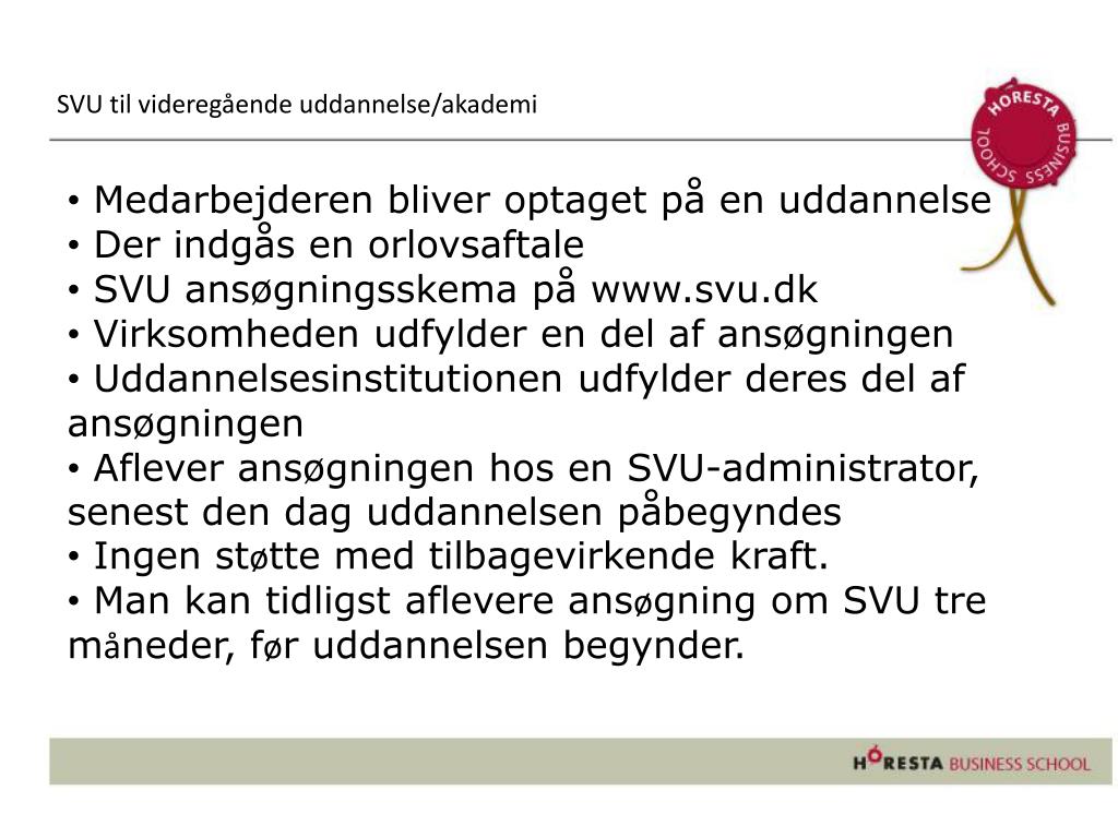 SVU til videregående uddannelse/akademi • Medarbejderen bliver optaget på en uddannelse • Der indgås en orlovsaftale • SVU ansøgningsskema på www.svu.dk • Virksomheden udfylder en del af ansøgningen • Uddannelsesinstitutionen udfylder deres del af ansøgningen • Aflever ansøgningen hos en SVU-administrator, • senest den dag uddannelsen påbegyndes • Ingen støtte med tilbagevirkende kraft. • Man kan tidligst aflevere ansøgning om SVU tre måneder, før uddannelsen begynder.