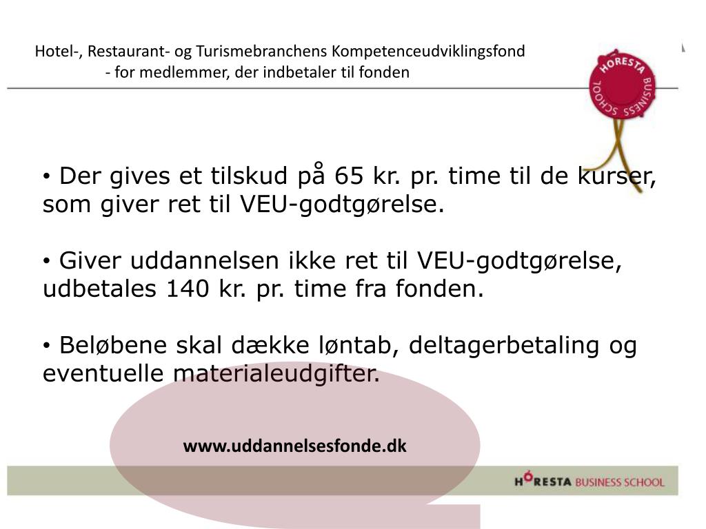 Hotel-, Restaurant- og Turismebranchens Kompetenceudviklingsfond - for medlemmer, der indbetaler til fonden • Der gives et tilskud på 65 kr. pr. time til de kurser, som giver ret til VEU-godtgørelse. • Giver uddannelsen ikke ret til VEU-godtgørelse, udbetales 140 kr. pr. time fra fonden. • Beløbene skal dække løntab, deltagerbetaling og eventuelle materialeudgifter. www.uddannelsesfonde.dk