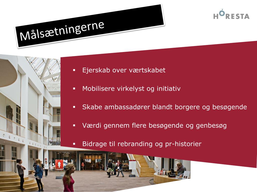 Målsætningerne . Ejerskab over værtskabet Mobilisere virkelyst og initiativ Skabe ambassadører blandt borgere og besøgende Værdi gennem flere besøgende og genbesøg Bidrage til rebranding og pr-historier
