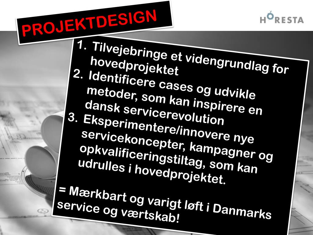PROJEKTDESIGN • Tilvejebringe et videngrundlag for hovedprojektet • Identificere cases og udvikle metoder, som kan inspirere en dansk servicerevolution • Eksperimentere/innovere nye servicekoncepter, kampagner og opkvalificeringstiltag, som kan udrulles i hovedprojektet. • = Mærkbart og varigt løft i Danmarks service og værtskab!