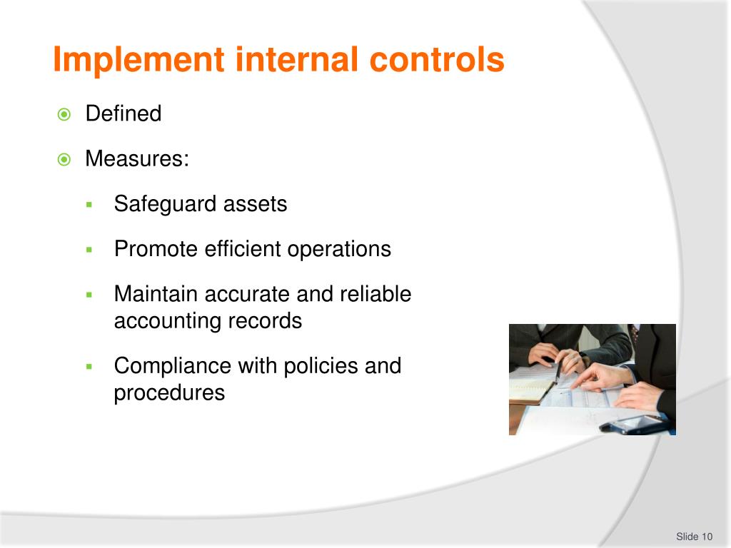 Implementinternal controls • Defined • Measures: • Safeguard assets • Promote efficient operations • Maintain accurate and reliable accounting records • Compliance with policies and procedures