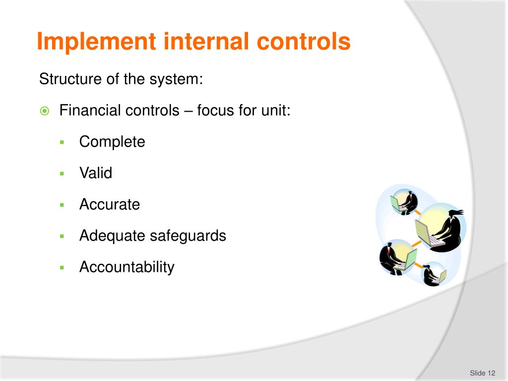 Implement internal controls Structure of the system: • Financial controls – focus for unit: • Complete • Valid • Accurate • Adequate safeguards • Accountability
