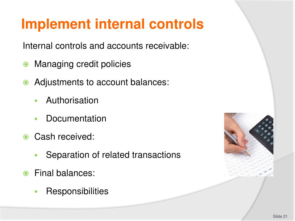 Implement internal controls Internal controls and accounts receivable: • Managing credit policies • Adjustments to account balances: • Authorisation • Documentation • Cash received: • Separation of related transactions • Final balances: • Responsibilities