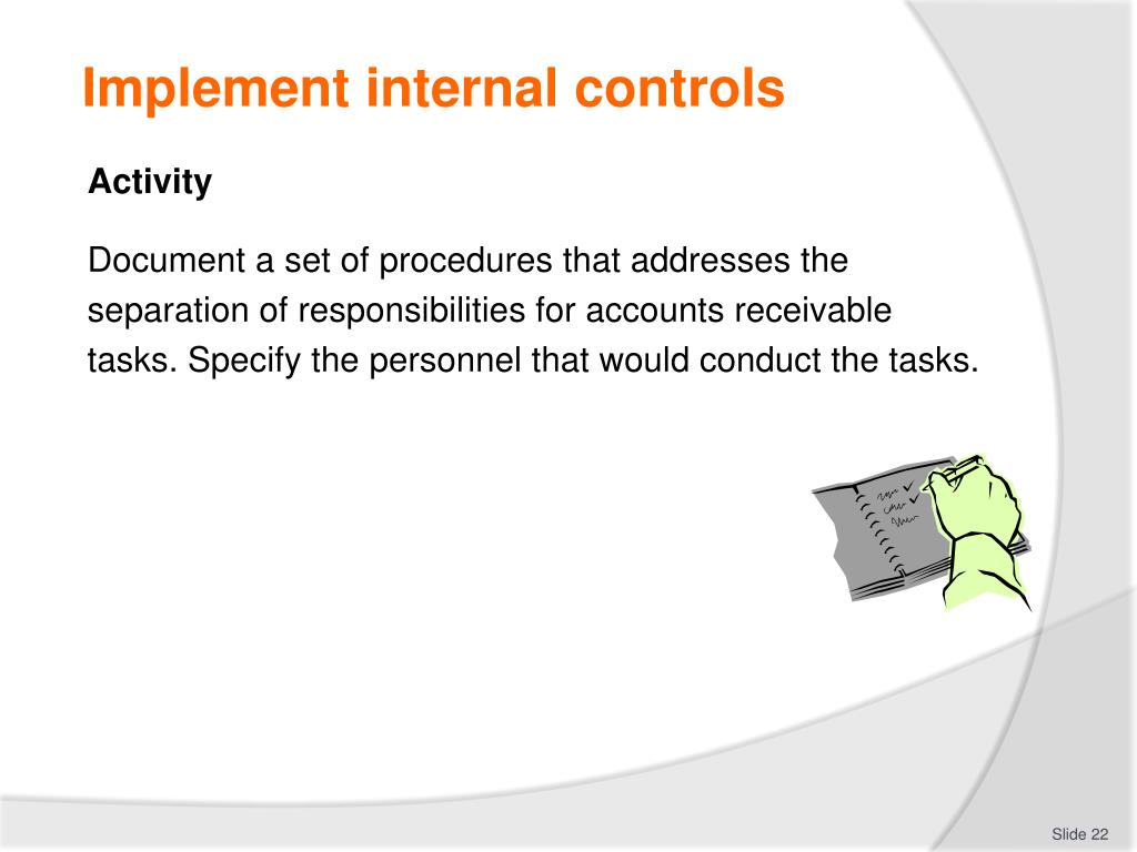 Implement internal controls Activity Document a set of procedures that addresses the separation of responsibilities for accounts receivable tasks. Specify the personnel that would conduct the tasks.