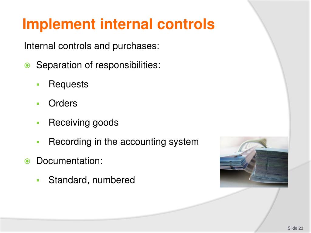 Implement internal controls Internal controls and purchases: • Separation of responsibilities: • Requests • Orders • Receiving goods • Recording in the accounting system • Documentation: • Standard, numbered