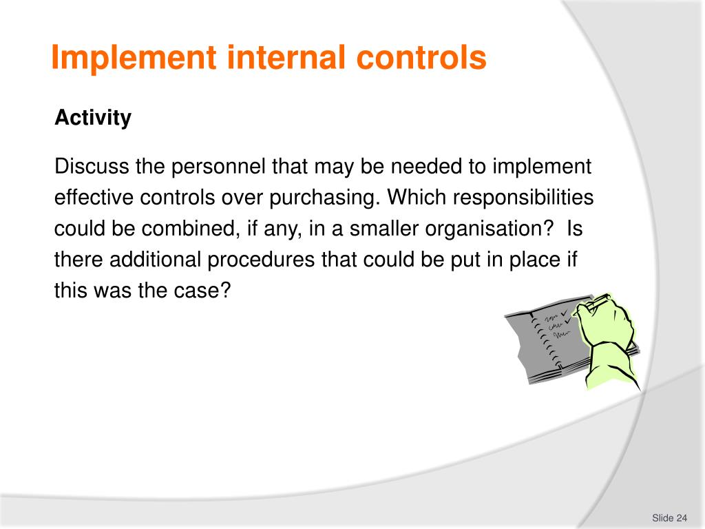 Implement internal controls Activity Discuss the personnel that may be needed to implement effective controls over purchasing. Which responsibilities could be combined, if any, in a smaller organisation? Is there additional procedures that could be put in place if this was the case?