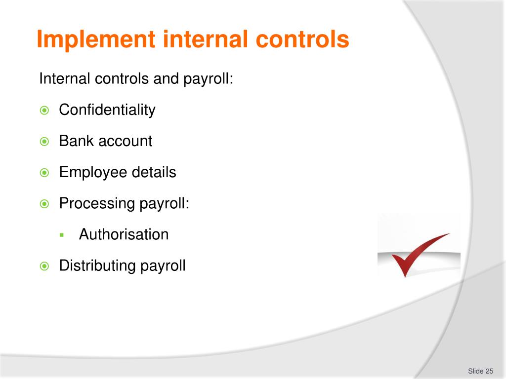 Implement internal controls Internal controls and payroll: • Confidentiality • Bank account • Employee details • Processing payroll: • Authorisation • Distributing payroll