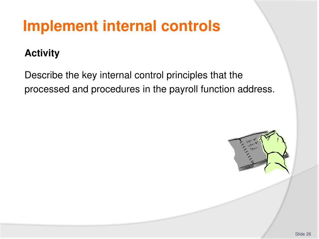 Implement internal controls Activity Describe the key internal control principles that the processed and procedures in the payroll function address.