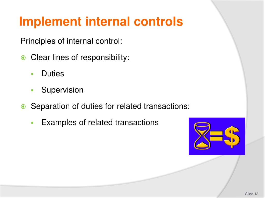 Implement internal controls Principles of internal control: • Clear lines of responsibility: • Duties • Supervision • Separation of duties for related transactions: • Examples of related transactions