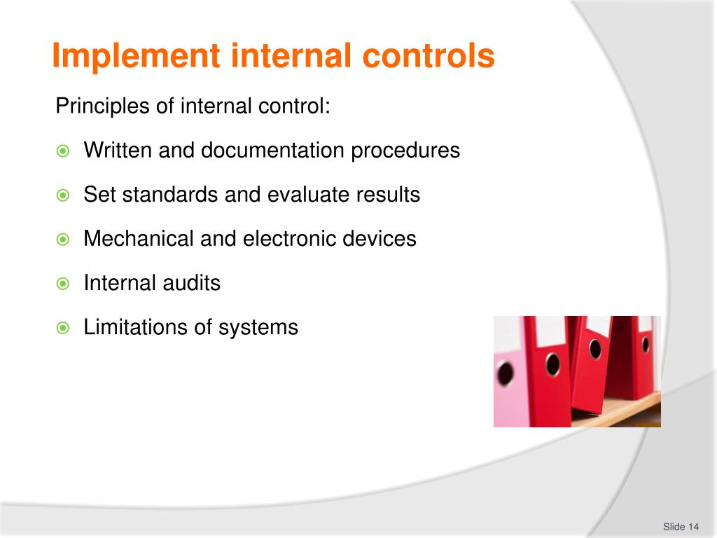 Implement internal controls Principles of internal control: • Written and documentation procedures • Set standards and evaluate results • Mechanical and electronic devices • Internal audits • Limitations of systems