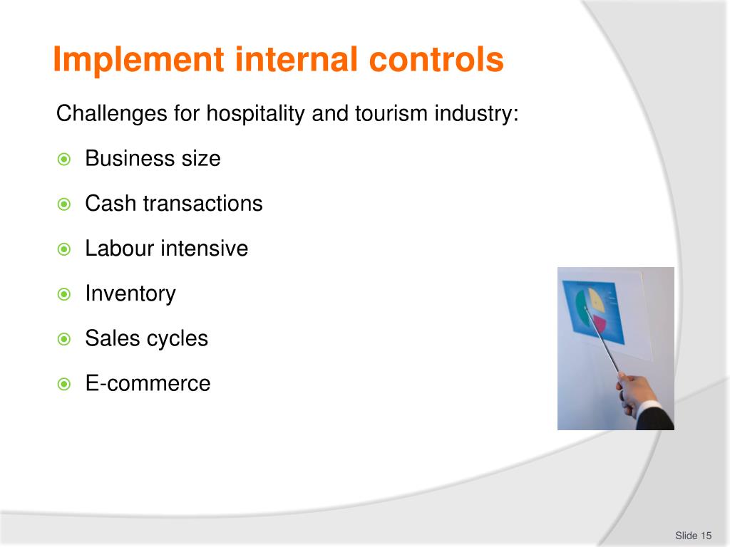 Implement internal controls Challenges for hospitality and tourism industry: • Business size • Cash transactions • Labour intensive • Inventory • Sales cycles • E-commerce
