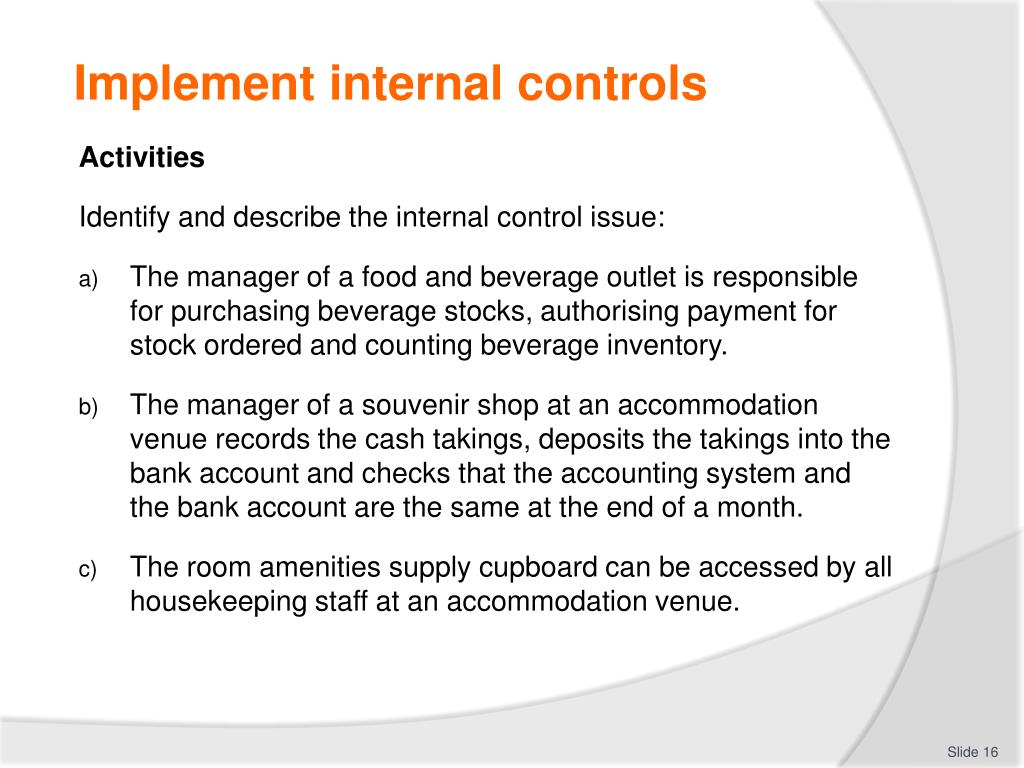 Implement internal controls Activities Identify and describe the internal control issue: • The manager of a food and beverage outlet is responsible for purchasing beverage stocks, authorising payment for stock ordered and counting beverage inventory. • The manager of a souvenir shop at an accommodation venue records the cash takings, deposits the takings into the bank account and checks that the accounting system and the bank account are the same at the end of a month. • The room amenities supply cupboard can be accessed by all housekeeping staff at an accommodation venue.