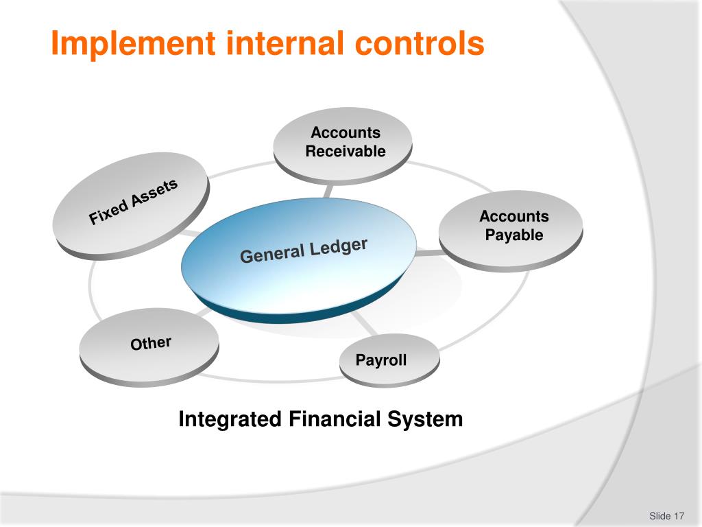 Implement internal controls • Accounts Receivable • Fixed Assets • Accounts Payable General Ledger • Other • Payroll Integrated Financial System