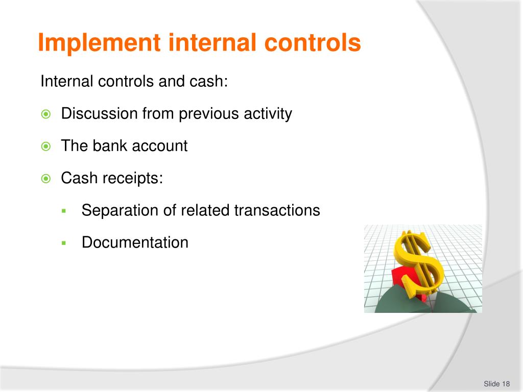 Implement internal controls Internal controls and cash: • Discussion from previous activity • The bank account • Cash receipts: • Separation of related transactions • Documentation