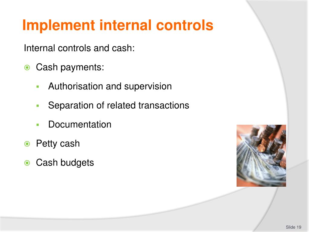Implement internal controls Internal controls and cash: • Cash payments: • Authorisation and supervision • Separation of related transactions • Documentation • Petty cash • Cash budgets