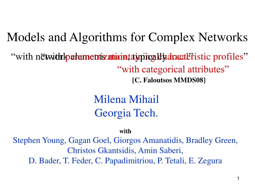 “with categorical attributes”. [C. Faloutsos MMDS08]. Models and Algorithms for Complex Networks. “with network elements maintaining characteristic profiles ”. “with parametrization , typically local ”. Milena Mihail Georgia Tech. with