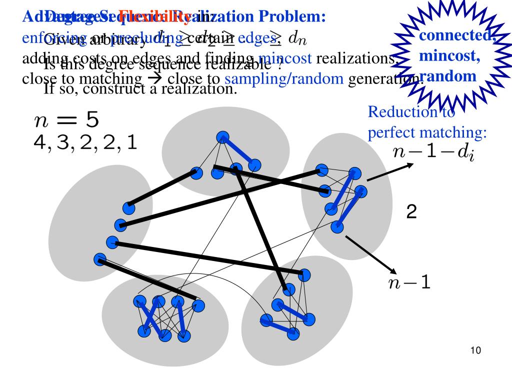 Degree Sequence Realization Problem: Given arbitrary Is this degree sequence realizable ? If so, construct a realization. Advantages:Flexibilityin: enforcing or precluding certain edges, adding costs on edges and finding mincost realizations, close to matching close to sampling/random generation. connected, mincost, random Reduction to perfect matching: 2