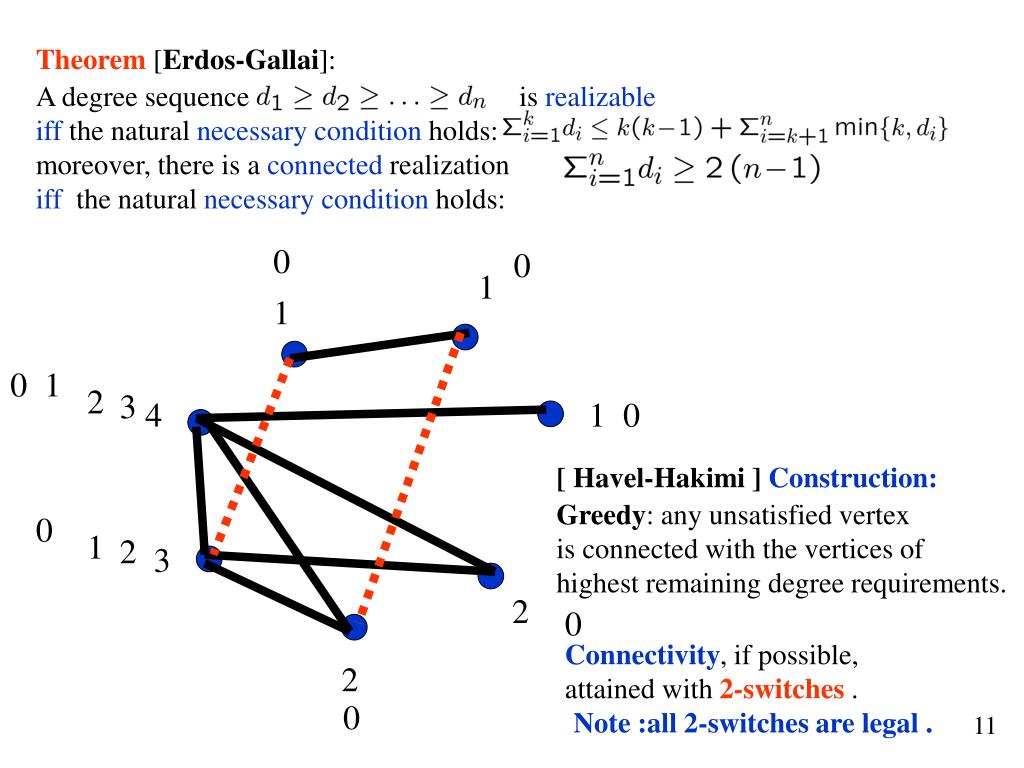 Theorem[Erdos-Gallai]: A degree sequence is realizable iff the natural necessarycondition holds: moreover, there is a connectedrealization iff the natural necessary condition holds: 1 1 4 1 3 2 2 0 0 0 1 2 3 0 [ Havel-Hakimi ] Construction: Greedy: any unsatisfied vertex is connected with the vertices of highest remaining degree requirements. 0 1 2 0 Connectivity, if possible, attained with 2-switches . 0 Note :all 2-switches are legal . 11