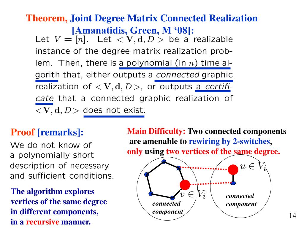 Theorem, Joint Degree Matrix Connected Realization [Amanatidis, Green, M ‘08]: Proof [remarks]: Main Difficulty: Two connected components are amenable to rewiring by 2-switches, only using two vertices of the same degree. The algorithm explores vertices of the same degree in different components, in a recursive manner. connected component connected component 14