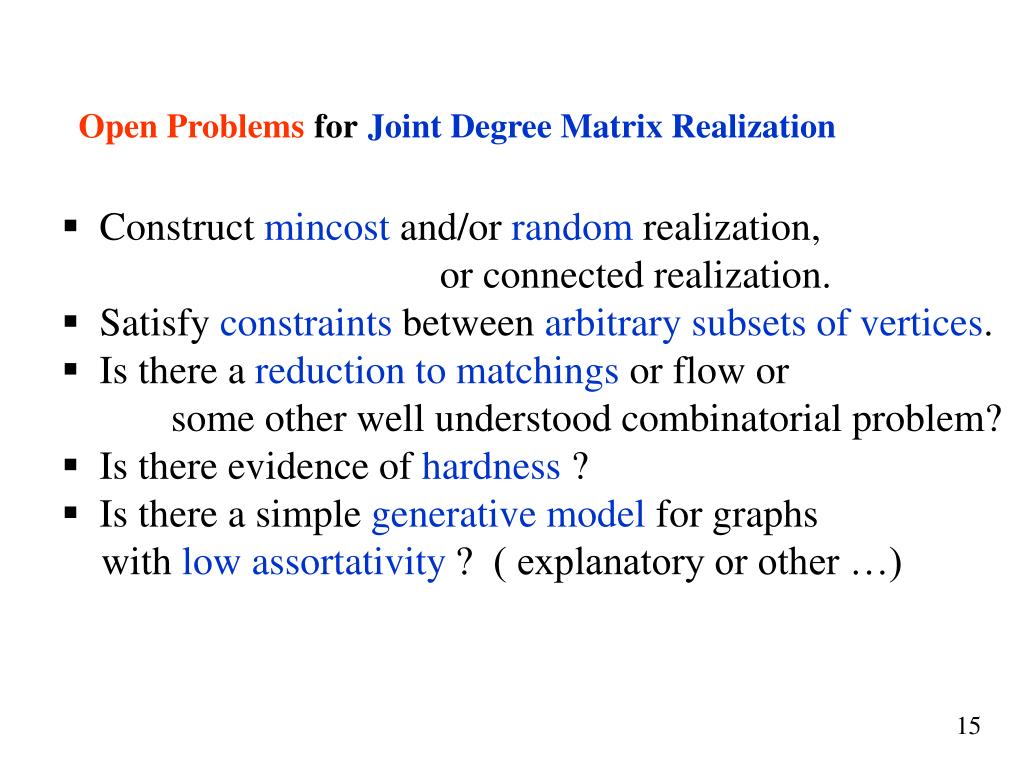 Open ProblemsforJoint Degree Matrix Realization • Construct mincost and/or random realization, or connected realization. • Satisfy constraints between arbitrary subsets of vertices. • Is there a reduction to matchings or flow or some other well understood combinatorial problem? • Is there evidence of hardness ? • Is there a simple generative model for graphs with low assortativity ? ( explanatory or other …) 15