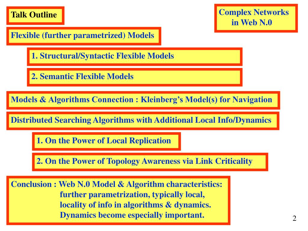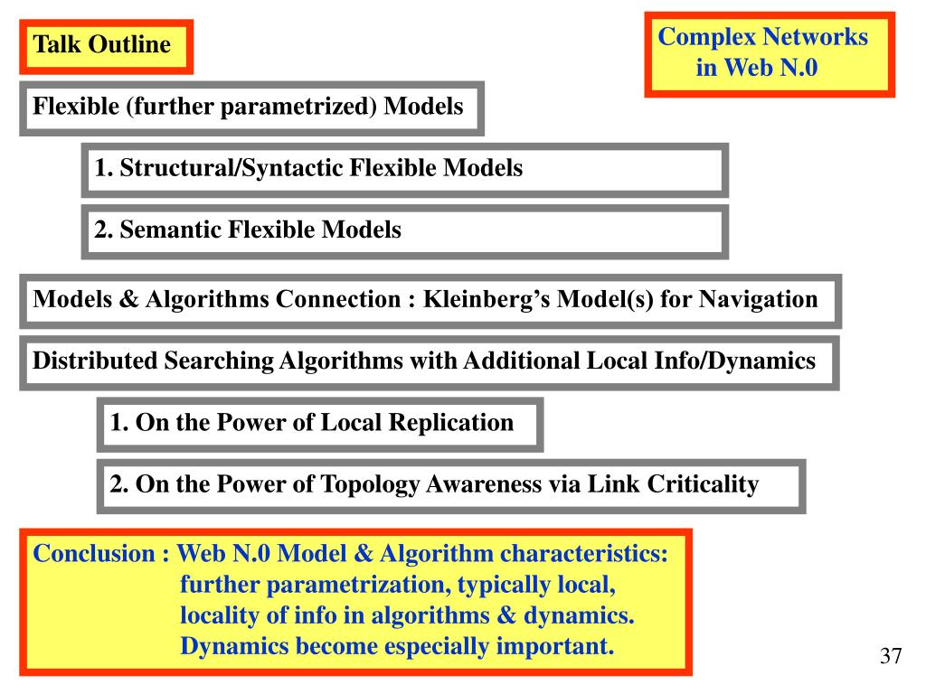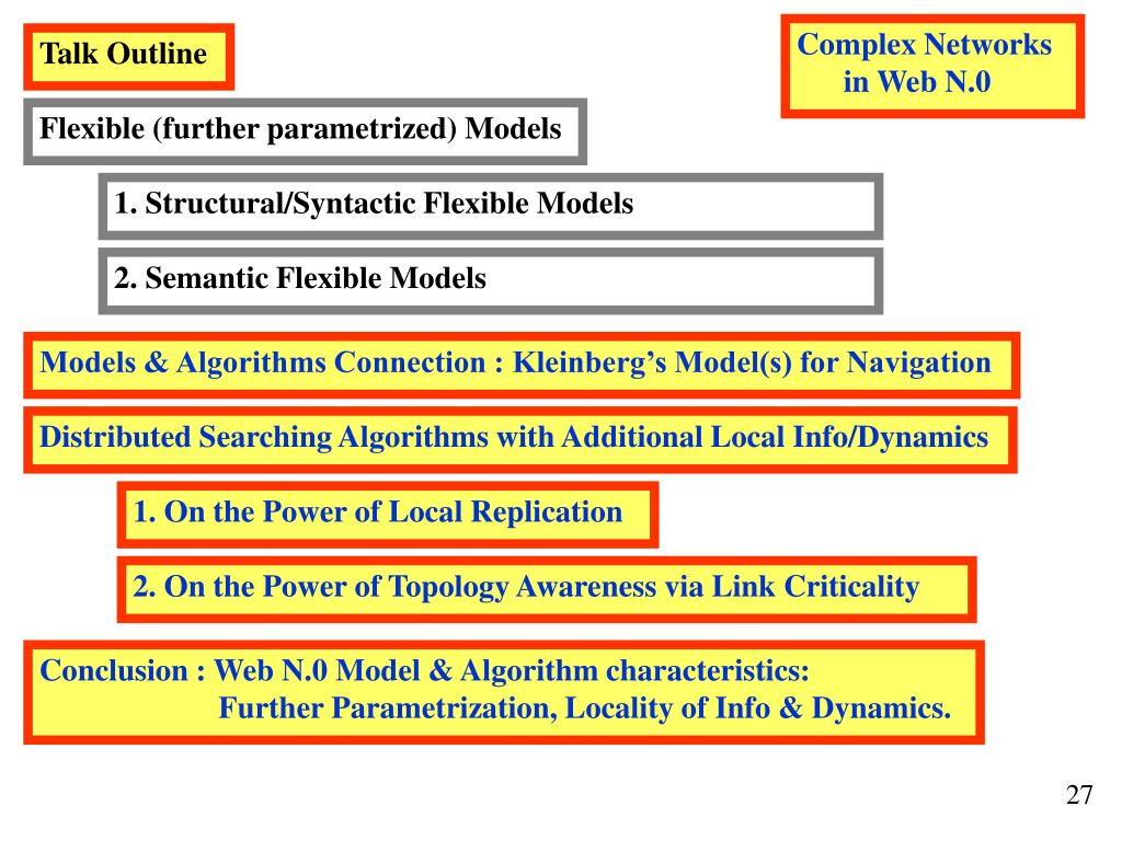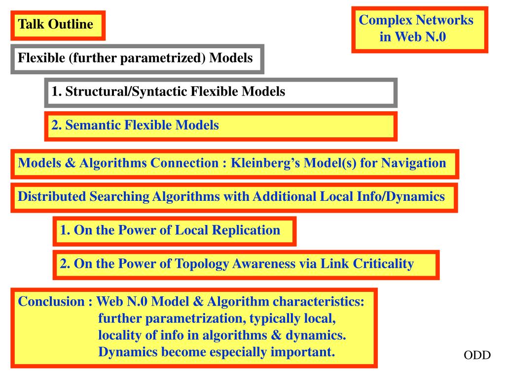 Complex Networks in Web N.0 Talk Outline Flexible (further parametrized) Models 1. Structural/Syntactic Flexible Models 2. Semantic Flexible Models Models & Algorithms Connection : Kleinberg’s Model(s) for Navigation Distributed Searching Algorithms with Additional Local Info/Dynamics 1. On the Power of Local Replication 2. On the Power of Topology Awareness via Link Criticality Conclusion : Web N.0 Model & Algorithm characteristics: further parametrization, typically local, locality of info in algorithms & dynamics. Dynamics become especially important. ODD