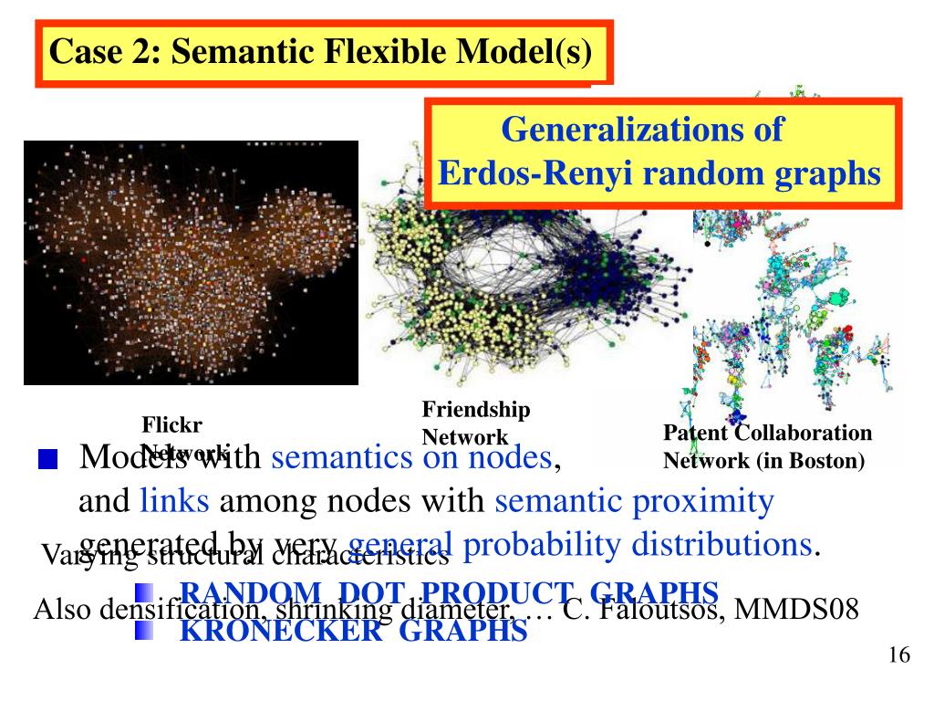 Models with semantics on nodes, and links among nodes with semantic proximity generated by verygeneral probability distributions. Friendship Network Flickr Network Patent Collaboration Network (in Boston) • RANDOM DOT PRODUCT GRAPHS • KRONECKER GRAPHS Varying structural characteristics Also densification, shrinking diameter, … C. Faloutsos, MMDS08 Case 2: Semantic Flexible Model(s) Generalizations of Erdos-Renyi random graphs 16
