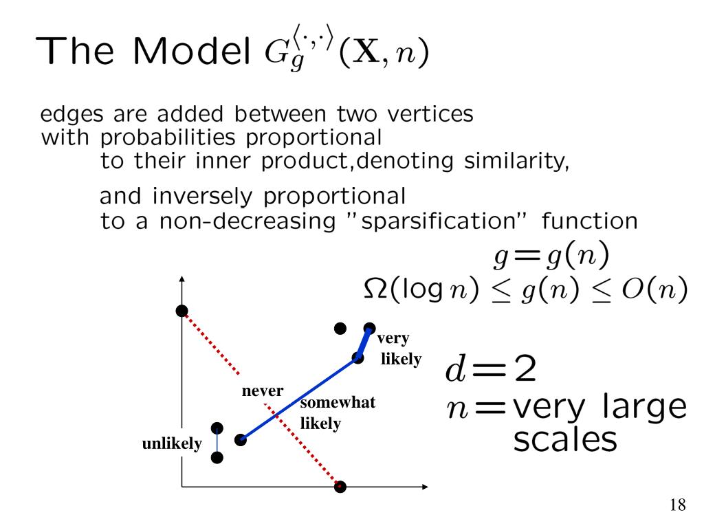 Open Problems forRandom Dot Product Graphs • Fit real data, and isolate “benchmark” distributions . • Characterize connectivity (diameter and conductance) as approaches . • Do/which further properties of X characterizefurther properties of ? • Evolution:X as a function of n ? (including: two connected vertices with small similarity, either disconnect, or increase their similarity). Should/can ? • Similarity functions beyond inner product (e.g. Kernel functions). • Algorithms: navigability, information/virus propagation, etc.