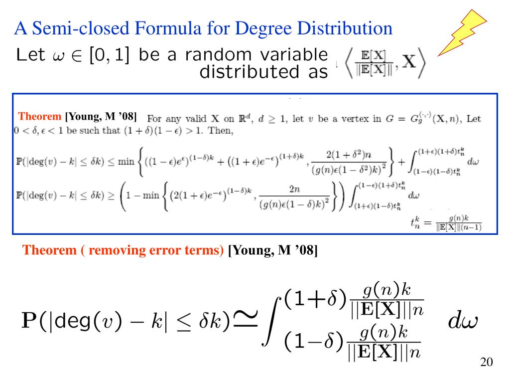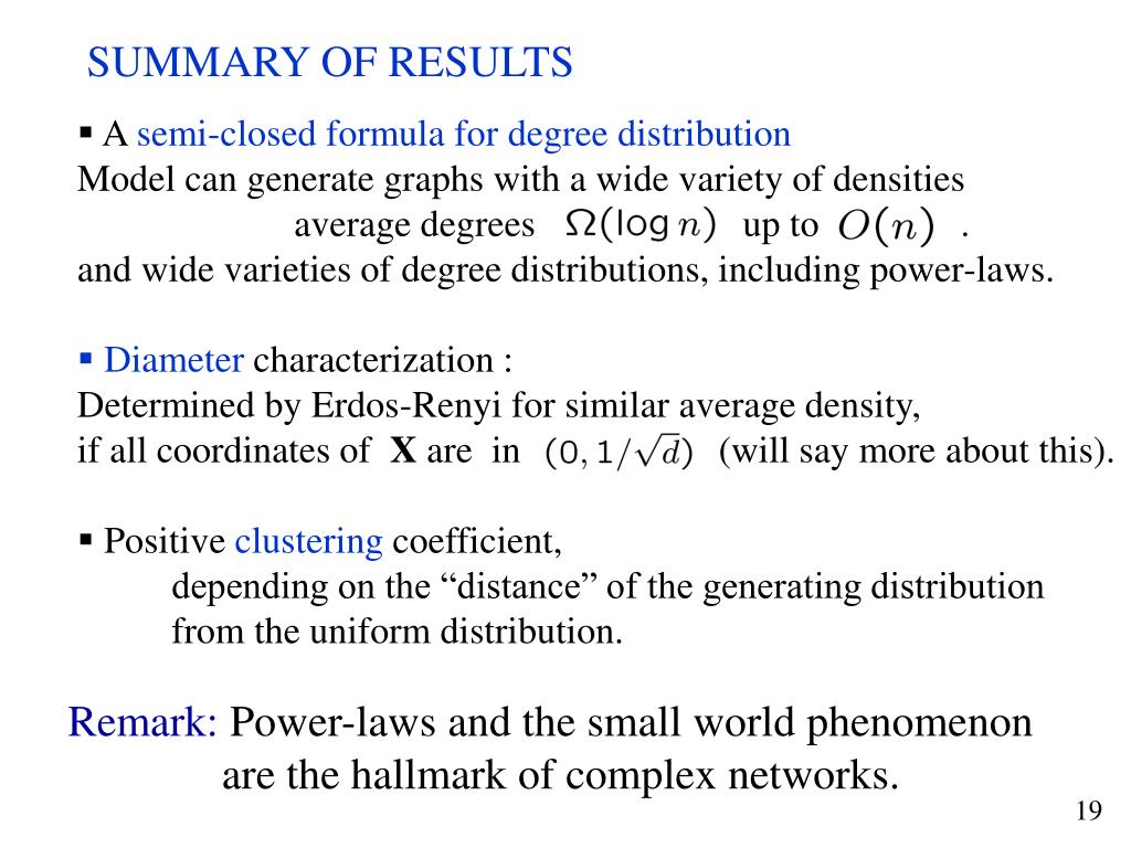SUMMARY OF RESULTS • A semi-closed formula for degree distribution Model can generate graphs with a wide variety of densities average degrees up to . and wide varieties of degree distributions, including power-laws. • Diameter characterization : Determined by Erdos-Renyi for similar average density, if all coordinates of X are in (will say more about this). • Positive clustering coefficient, depending on the “distance” of the generating distribution from the uniform distribution. Remark: Power-laws and the small world phenomenon are the hallmark of complex networks. 19
