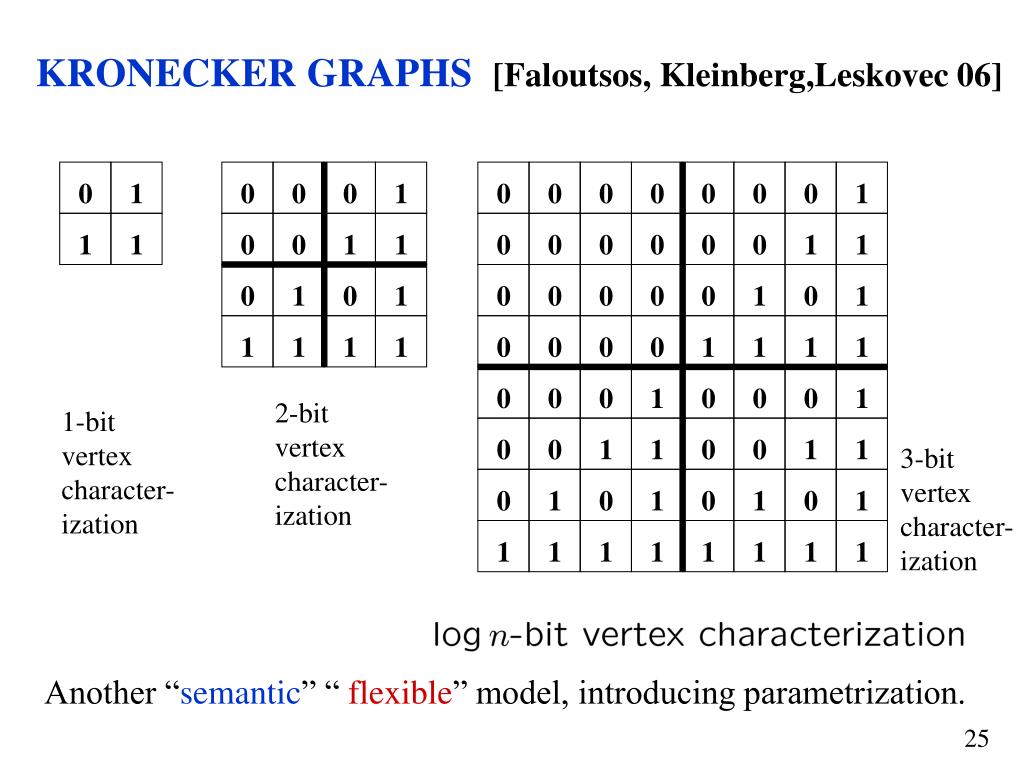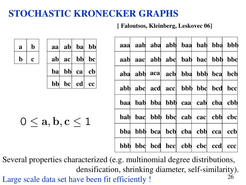 0 1 0 0 0 1 1 1 0 0 1 1 0 1 0 1 1 1 1 1 KRONECKER GRAPHS [Faloutsos, Kleinberg,Leskovec 06] 0 0 0 0 0 0 0 1 0 0 0 0 0 0 1 1 0 0 0 0 0 1 0 1 0 0 0 0 1 1 1 1 0 0 0 1 0 0 0 1 2-bit vertex character- ization 1-bit vertex character- ization 0 0 1 1 0 0 1 1 3-bit vertex character- ization 0 1 0 1 0 1 0 1 1 1 1 1 1 1 1 1 Another “semantic” “ flexible” model, introducing parametrization. 25