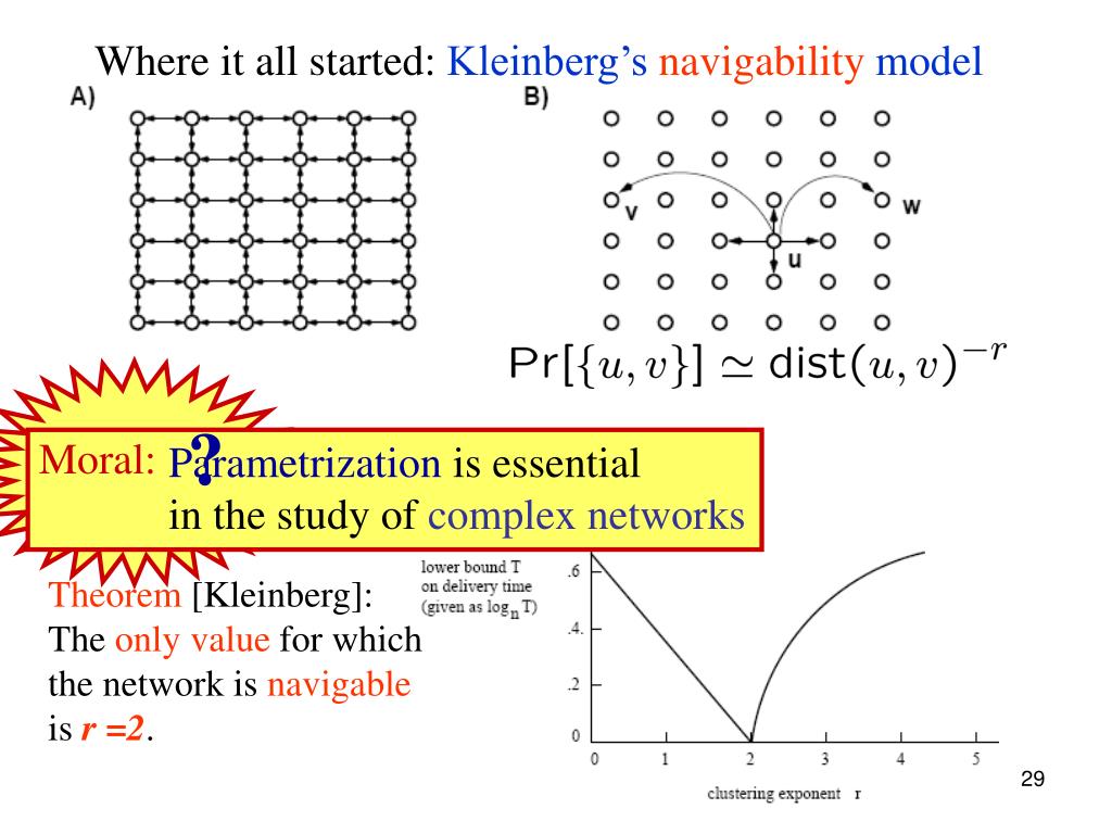 Where it all started: Kleinberg’s navigability model ? Moral: Parametrization is essential in the study of complex networks Theorem [Kleinberg]: The only value for which the network is navigable isr =2.