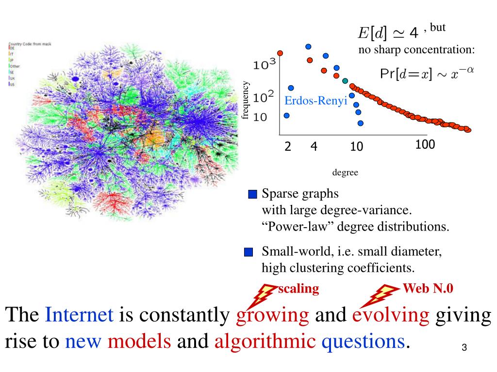 , but no sharp concentration: frequency Erdos-Renyi 100 2 4 10 degree Sparse graphs with large degree-variance. “Power-law” degree distributions. Small-world, i.e. small diameter, high clustering coefficients. scaling Web N.0 The Internet is constantly growing and evolving giving rise to new models and algorithmic questions.