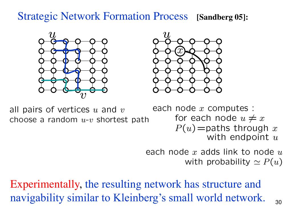 Strategic Network Formation Process [Sandberg 05]: Experimentally, the resulting network has structure and navigability similar to Kleinberg’s small world network. 30