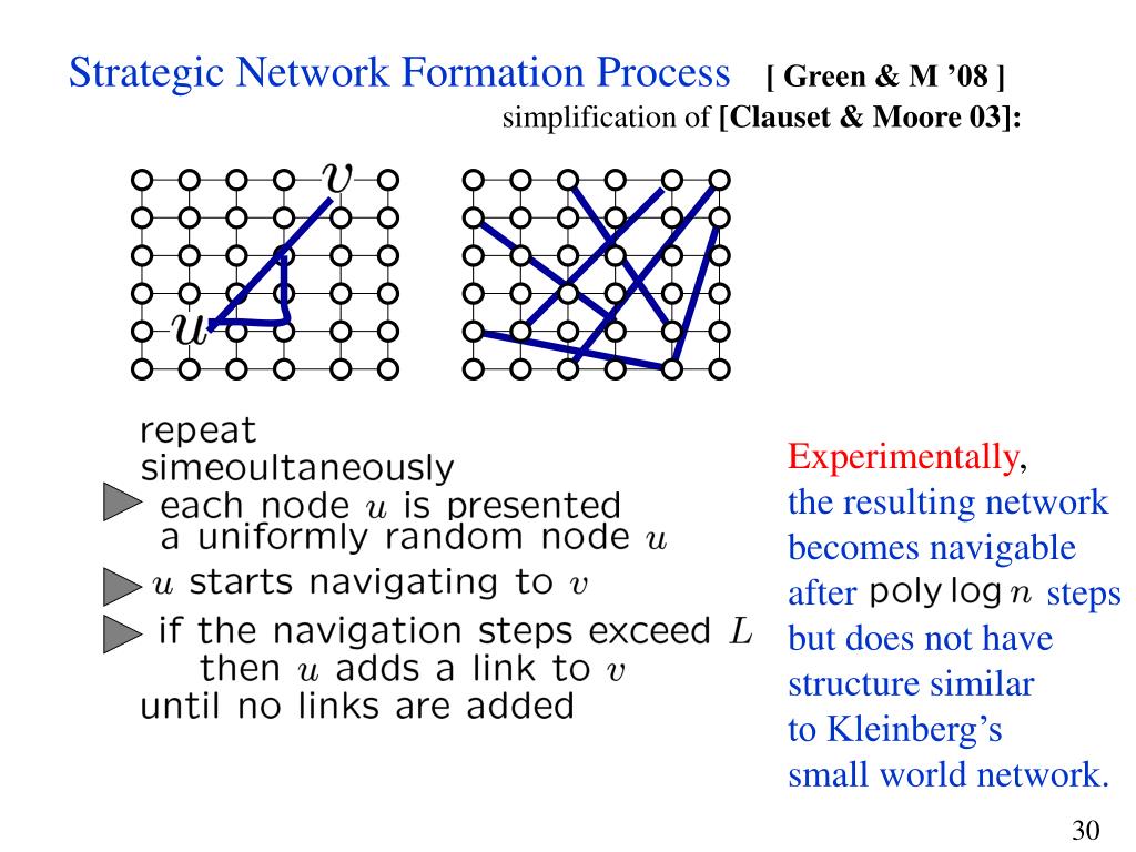 Strategic Network Formation Process [ Green & M ’08 ] simplification of [Clauset & Moore 03]: Experimentally, the resulting network becomes navigable after steps but does not have structure similar to Kleinberg’s small world network. 30