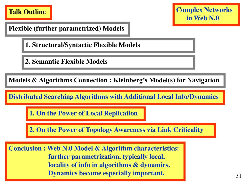 Complex Networks in Web N.0 Talk Outline Flexible (further parametrized) Models 1. Structural/Syntactic Flexible Models 2. Semantic Flexible Models Models & Algorithms Connection : Kleinberg’s Model(s) for Navigation Distributed Searching Algorithms with Additional Local Info/Dynamics 1. On the Power of Local Replication 2. On the Power of Topology Awareness via Link Criticality Conclusion : Web N.0 Model & Algorithm characteristics: further parametrization, typically local, locality of info in algorithms & dynamics. Dynamics become especially important. 31