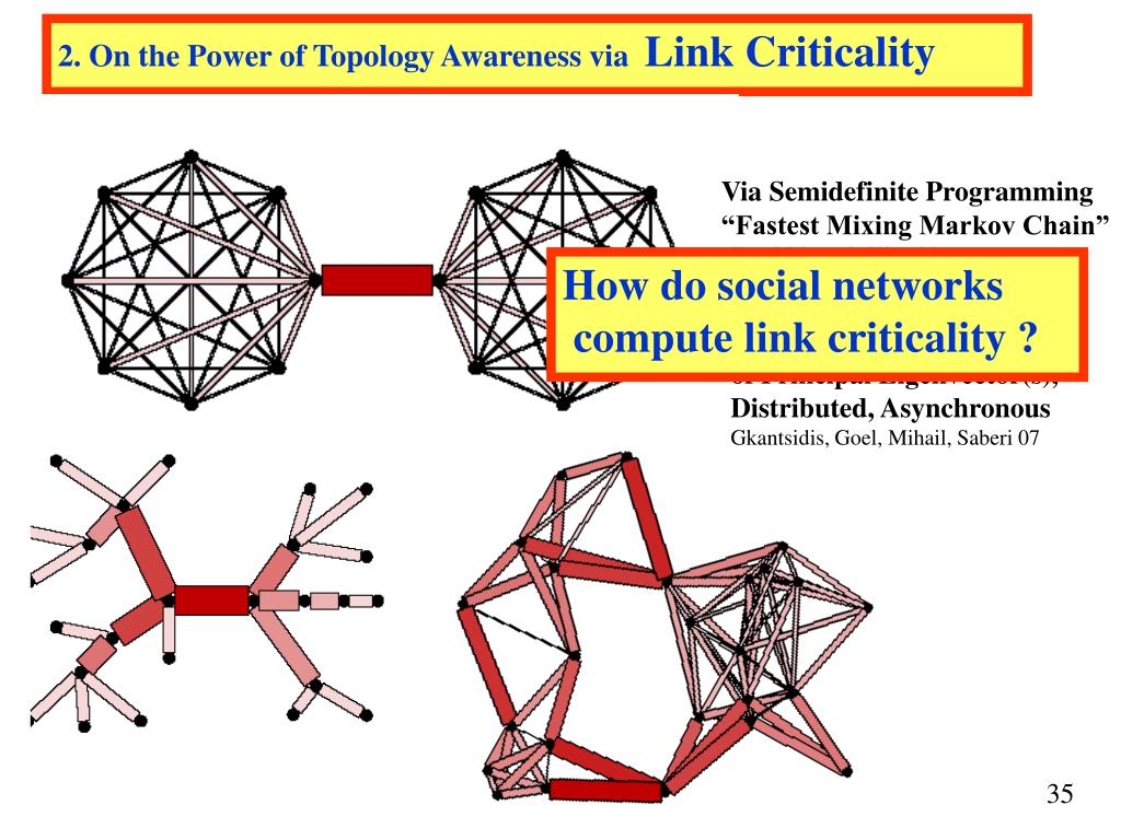 Via Semidefinite Programming “Fastest Mixing Markov Chain” Boyd,Diaconis,Xiao 04 Via Computation of Principal Eigenvector(s), Distributed, Asynchronous Gkantsidis, Goel, Mihail, Saberi 07 2. On the Power of Topology Awareness via Link Criticality How do social networks compute link criticality ? 35