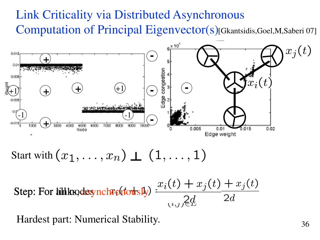 + + + + - - - - - + Start with Step: For all nodes Step: For links, asynchronously Link Criticality via Distributed Asynchronous Computation of Principal Eigenvector(s) [Gkantsidis,Goel,M,Saberi 07] +1 +1 -1 -1 Hardest part: Numerical Stability. 36