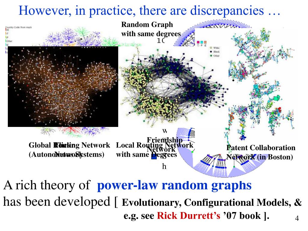 However, in practice, there are discrepancies … , but no sharp concentration: frequency Erdos-Renyi 100 2 4 10 degree Sparse graphs with large degree-variance. “Power-law” degree distributions. Friendship Network Flickr Network Patent Collaboration Network (in Boston) Small-world, i.e. small diameter, high clustering coefficients. Random Graph with same degrees Global Routing Network (Autonomous Systems) Local Routing Network with same Degrees A rich theory of power-law random graphs has been developed [ Evolutionary, Configurational Models, & e.g. see Rick Durrett’s ’07 book ]. 4