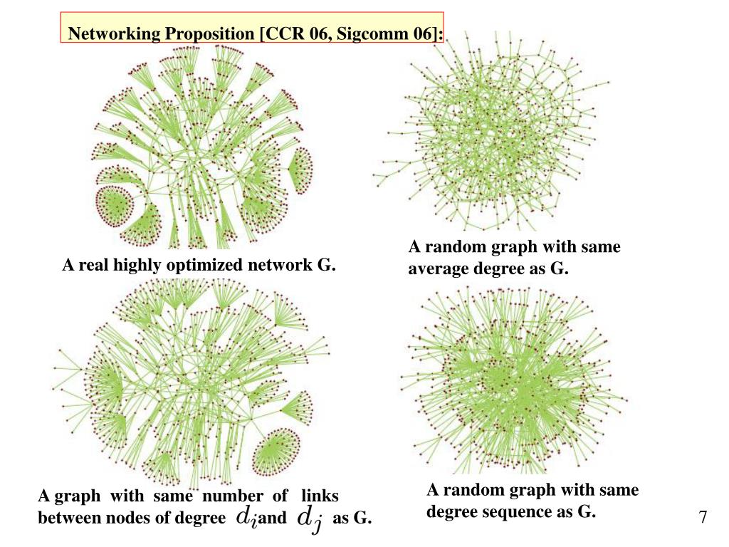 Networking Proposition [CCR 06, Sigcomm 06]: A random graph with same average degree as G. A real highly optimized network G. A random graph with same degree sequence as G. A graph with same number of links between nodes of degree and as G. 7 A graph with same as G. A random graph with same degree sequence as G. A graph with same as G. A random graph with same degree sequence as G. A random graph with same degree sequence as G. A random graph with same degree sequence as G. A random graph with same degree sequence as G. A random graph with same degree sequence as G.