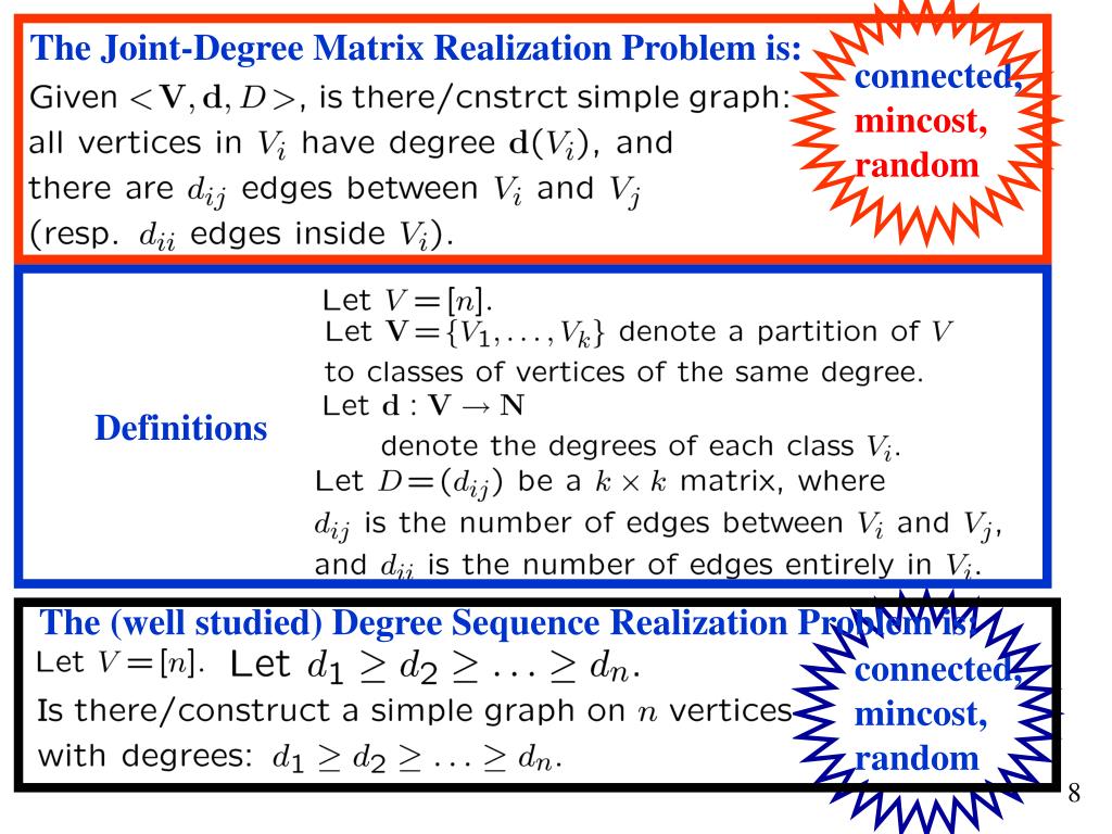 The Joint-Degree Matrix Realization Problem is: connected, mincost, random connected, mincost, random Definitions The (well studied) Degree Sequence Realization Problem is: 8