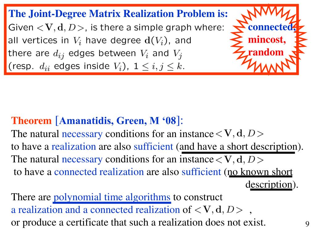 The Joint-Degree Matrix Realization Problem is: connected, mincost, random Theorem [Amanatidis, Green, M ‘08]: The natural necessary conditions for an instance to have a realization are also sufficient (and have a short description). The natural necessary conditions for an instance to have a connected realization are also sufficient (no known short description). There are polynomial time algorithms to construct a realization and a connected realization of , or produce a certificate that such a realization does not exist. 9